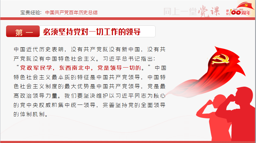 彭艳同志全面地讲述了中国共产党从新民主主义革命时期完成救国大业开始,直至党在新时代推进强国大业建设走过的百年历程。彭艳同志指出,这百年是用鲜血、汗水、泪水、勇气、智慧、力量写就的,是披荆斩棘、艰苦创业、砥砺前行、充满艰险、充满神奇的百年,是苦难中铸就辉煌、挫折后毅然奋起、探索中收获成功、失误后拨乱反正、转折中开创新局、奋斗后赢得未来的百年。彭艳同志强调,中国共产党百年奋斗的十三条宝贵经验,是实现中华民族伟大复兴之梦的重要保障,是每位党员在今后的工作中必须遵守、继承和发扬的基本准则。