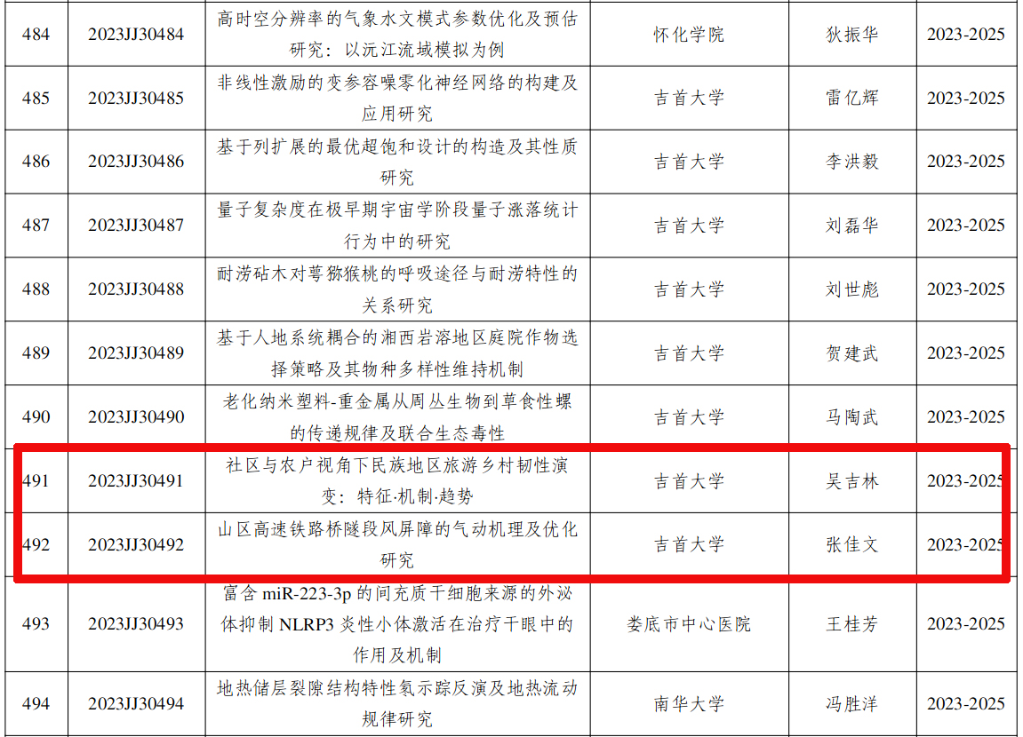 近日,湖南省自然科学基金委员会发布《2023年度湖南省自然科学基金项目实施目标、实施时间及立项名单》,公司吴吉林教授申报的“社区与农户视角下民族地区旅游乡村韧性演变:特征·机制·趋势”,张佳文博士申报的“山区高速铁路桥隧段风屏障的气动机理及优化研究”获批立项。
