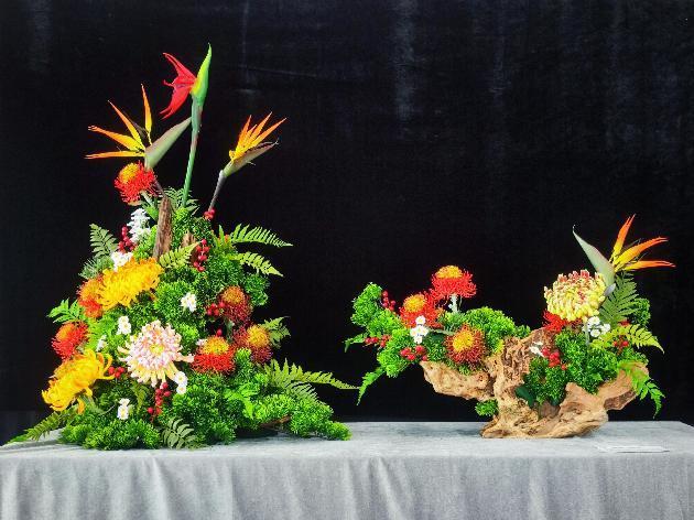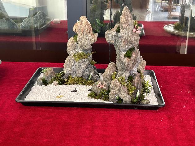 插花作品通过巧妙的构思和精湛的技艺,将花材与器皿完美结合,呈现出了一幅幅古朴典雅、韵味十足的花艺作品,同时大胆创新,运用新材料、新技法,创作出了充满现代感和时尚气息的花艺佳作;假山盆景利用泡沫、铁丝等材料进行生动刻画真实山体的形状及颜色,灵动自然。这些作品让人欣赏到了插花艺术和假山盆景的魅力所在,走进展出大厅,仿佛置身于一个个精心雕琢的小场景之中,各式各样的插花作品错落有致地摆放在大厅内,每一件作品都别具一格,让人流连忘返。有的插花作品以清新淡雅为垂题,花朵与绿叶相互映衬,一抹春色;有的假山作品则以雄浑壮观为特色,假山巍峨耸立,绿意点设其间。