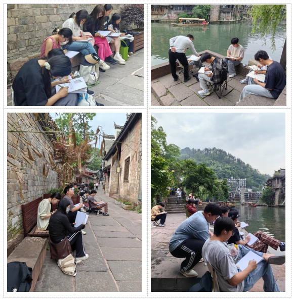 为进一步增强城乡规划专业员工的美术写生实践能力,夯实设计基础,提高美学素养,2025年5月13日至5月19日,谭春燕、左娅、陈明春和肖想4位专业老师带领2024级城乡规划专业全体师生,共赴湘西土家族苗族自治州凤凰古城开展为期7天的美术写生实践。本次活动以“绘凤凰古韵谱建设新章”为主题,通过现场写生创作,在感知传统吊脚楼建筑文化魅力、提高审美艺术素养的同时,助力员工将课堂理论知识转化为课外实践能力。